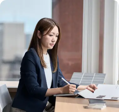 設計職は、建設予定地に合わせたコンセプトを企画し、設計図を作成する仕事です。開発予定地が決まると、現地調査や役所との協議を行い、法令を遵守しながら建物の規模や形を検討します。その際、事業性や建築費を考慮し、効率的な構造フレームを立案します。また、周辺環境や利便性、安全性に配慮しながら、共用部や外観、外構のデザインを設計し、高い付加価値を持つ住まいを提案します。コンセプトが固まったら、設計図書を作成し、行政機関や協力設計事務所と連携して申請業務を進めます。さらに、広告代理店などにデザインコンセプトやパース(完成予想図)を提供し、販促活動にも関わります。建設が始まると、設計図どおりに工事が進んでいるかをチェックし、品質を管理することも重要な役割です。また、お客さまとの商談を行うマンションギャラリーの設計コンサルティングを行う場合もあります。空間構成や室内外の建材選定にも関わり、マンションの設計コンセプトを表現します。
